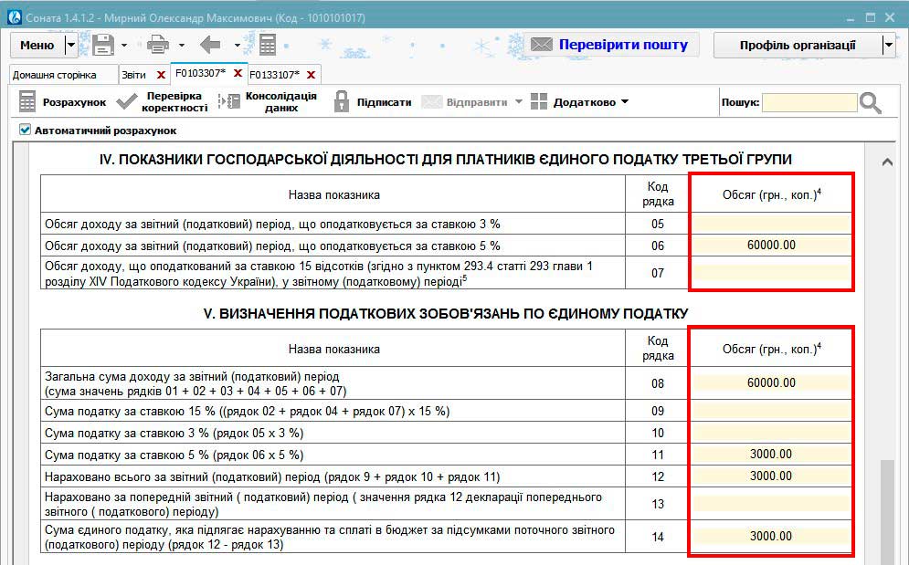 Програма автоматично заповнює розділи: ІV. ПОКАЗНИКИ ГОСПОДАРСЬКОЇ ДІЯЛЬНОСТІ ДЛЯ ПЛАТНИКІВ ЄДИНОГО ПОДАТКУ ТРЕТЬОЇ ГРУПИ і V. ВИЗНАЧЕННЯ ПОДАТКОВИХ ЗОБОВ’ЯЗАНЬ ПО ЄДИНОМУ ПОДАТКУ в ПОДАТКОВІЙ ДЕКЛАРАЦІЇ ПЛАТНИКА ЄДИНОГО ПОДАТКУ – ФОП (F0103307) та розраховує суму податку згідно з даними, введеними при заповненні Майстра Єдиного податку.