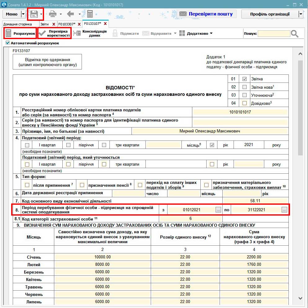 При створенні через Майстер Єдиного податку програма заповнює поля шапки Додатка 1 даними з профілю підприємця та поля таблиці 9. Так автоматично заповнюються поля колонки 2 значеннями мінімальної заробітної плати по кожному місяцю звітного року за замовчуванням. Також автоматично розраховується та записується в колонку 4 сума єдиного внеску. У випадках, коли дохід в якомусь місяці(ях) був більше, то записи по них в колонці 2 коригуються в ручному режимі.