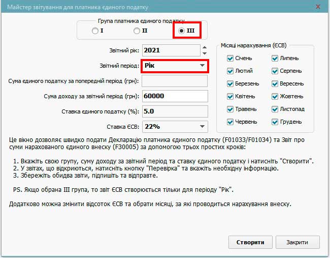 Відкриється вікно, в якому потрібно вибрати: групу платника ЄП; звітний рік; звітний період: Рік (для ІІІ групи); заповнити суму доходу в гривнях; вказати ставку ЄП в % та натиснути кнопку Створити.
