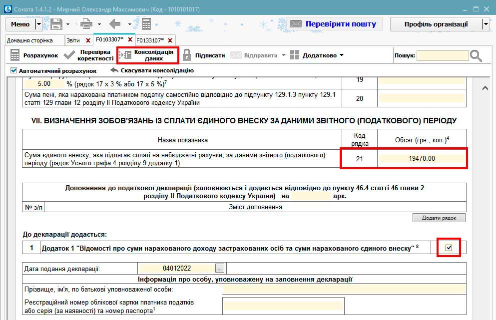 Для заповнення ряд.21 розділу VІІ Декларації потрібно перенести суму єдиного внеску, яка підлягає сплаті за звітний період з Додатка 1. Для цього потрібно натиснути кнопку Консолідація даних.