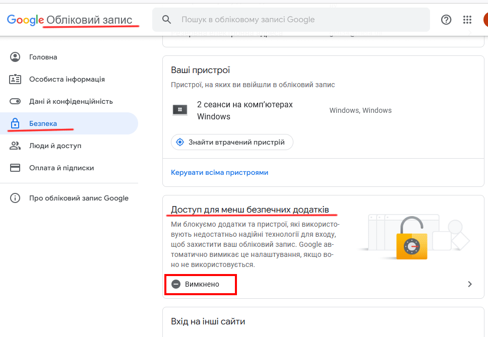 Перевірити стан для менш безпечних додатків у Вашому обліковому запису (аккаунті) Google можна в розділі Безпека.