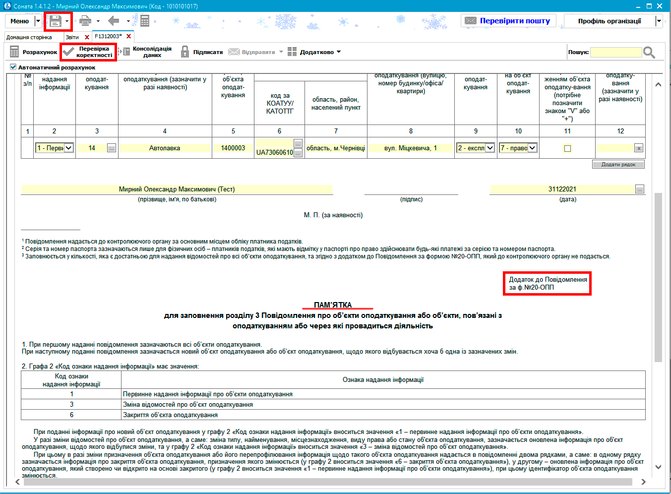 Після внесення даних потрібно натиснути кнопку Перевірка коректності. Якщо все вірно – натиснути на дискету (Зберегти). Повідомлення буде збережене в розділі Звіти.