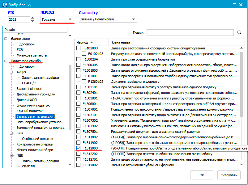 Для створення повідомлення за ф. №20-ОПП (J/F1312002) потрібно вибрати Меню – Створити – Новий звіт.