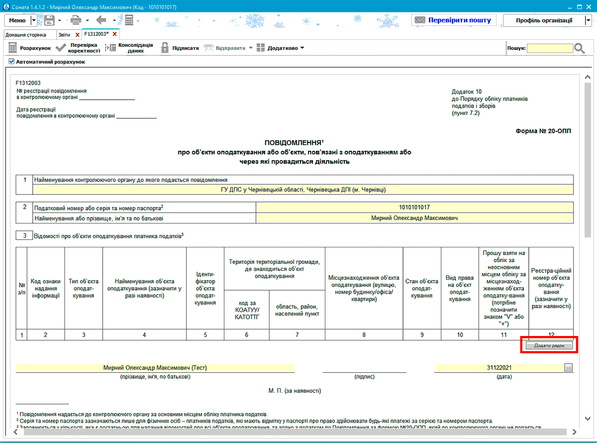 Програма заповнює поля розділу 1 та розділу 2 даними з профілю підприємства/ФОП. Вам потрібно заповнити таблицю розділу 3. Для цього потрібно натиснути кнопку Додати рядок в правому нижньому куті під таблицею.