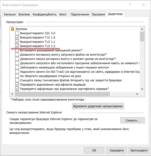 Для відправки звітності для власників систем з Windows 7 та вище потрібно перевірити рівень безпеки в Internet Explorer (IE) (браузер) – Налаштування – Додатково – Безпека (Використовувати TLS 1.2)