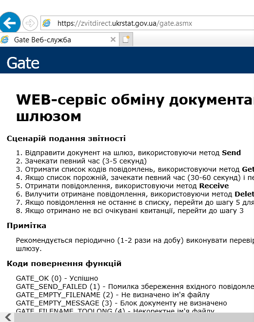 Для перевірки працездатності вашої системи для відправлення звітності до ДССУ та працездатність шлюзу перевірте в Internet Explorer (IE) наступне посилання: https://zvitdirect.ukrstat.gov.ua/gate.asmx