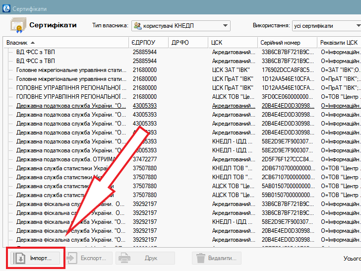 Іноді потрібно прибрати з програми старі сертифікати. Перейдіть до списку “Меню – Сертифікати” та видаліть усі сертифікати з вашим кодом ЄДРПОУ.