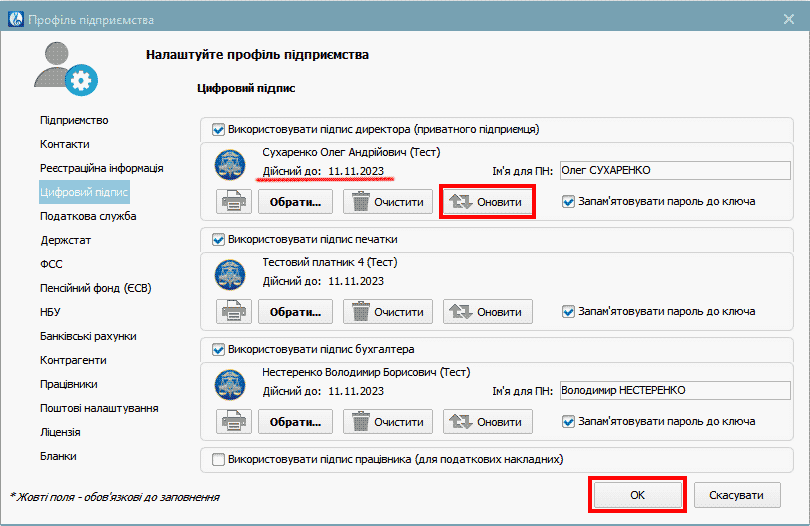 3. Перейдіть до налаштувань поточного профілю, сторінка “Цифровий підпис” та біля кожного активного ключа натисніть кнопку “Оновити“. Якщо все зроблено коректно, то прострочена дата “Дійсний до:” біля ключа зміниться. Вона повинна показувати нову дату закінчення дії ключа.